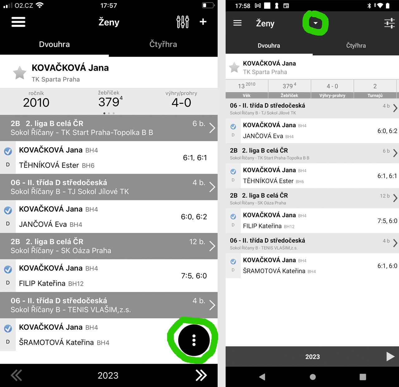 Aplikace ČTS: Přepínání mezi věkovými kategoriemi v aktivitě hráče10.07.2023 Aktivita (profil) hráče zobrazuje odehrané zápasy v dané sezóně (přepínač sezón dole) v dané věkové kategorii. Pokud si chcete zobrazit odehrané zápasy v jiné věkové kategorii, použijte přepínač, který najdete na iphonu vpravo dole (černé kolečko se 3 tečkami). Na telefonech android je přepínač úplně nahoře u názvu věkové kategorie a vypadá jako zobáček. Přepínání mezi výsledky dvouhry a čtyřhry najdete nad jménem hráče a je řešen formou záložek.