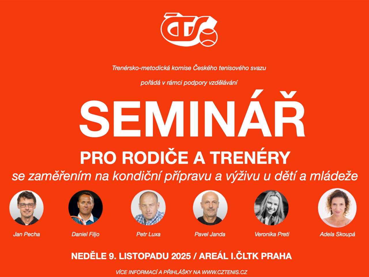 Seminář ČTS pro rodiče a trenéry V neděli 9. listopadu 2025 se v areálu I.ČLTK Praha na ostrově Štvanice uskuteční teoreticko-praktický seminář pro rodiče a trenéry. Seminář se zaměřuje na dlouhodobou koncepci tenisové přípravy, se zaměřením kondiční přípravu a výživu dětí a mládeže. Garantem semináře je člen TMK ČTS a vedoucí trenér tenisové školy Markéty Vondroušové Jan Pecha, mezi dalšími přednášejícími se představí sportovní manažer a bývalý hráč Petr Luxa, šéftrenér TK Sparta Praha Daniel Filjo, kondiční trenér I.ČLTK Praha Pavel Janda a specialistky na výživu Veronika Preti a Adela Skoupá. Akce je pro účastníky zdarma, během semináře je pro všechny připraven brunch v místní restauraci. Přihlášení zde.