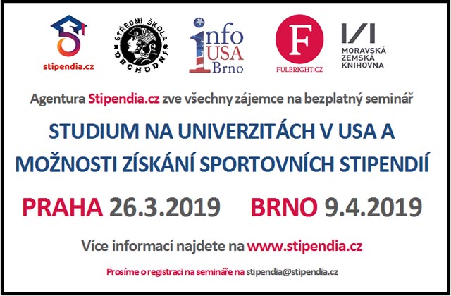 Sportovní stipendia v USA, semináře Agentura Stipendia.cz již několik let pořádá pro všechny zájemce o studium na univerzitách v USA pravidelné bezplatné semináře, kde jsou prezentovány veškeré základní informace o studiu a především možnostech získání sportovních a akademických stipendií na univerzitách v USA. Další připravované semináře se budou konat 26.3.2019 v prostorách Střední školy obchodní v Praze a 9.4.2019 v Moravské zemské knihovně v Brně. Tyto semináře jsou určené nejen pro studenty středních škol, ale také pro studenty vysokých škol, kteří mají možnost transferovat na univerzitu do USA. Více informací najdete na www.stipendia.cz.